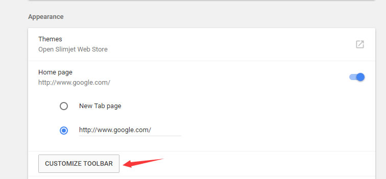 If you don't have the little triangle visible, you can customize the toolbar by selecting "Settings" from the browser menu to open the browser settings page. After that, scroll to the "Appearance" section and click the "Customize toolbar" button, as shown below,